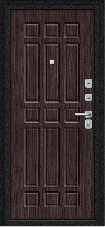 Надежная входная Дверь Браво Мило МФ/BChrome Букле черное/Букле черное/Wenge Melinga премиум класса по цене 31 207 руб. Большая толщина стали защитит от проникновения в ваш дом, квартиру или коттедж. Используется очень качественная фурнитура: замки, цилиндры, ручки, защелки. Покрытие и отделка двери изготовлено под внимательным контролем производителя. Дверь имеет долгий срок службы и гарантию.