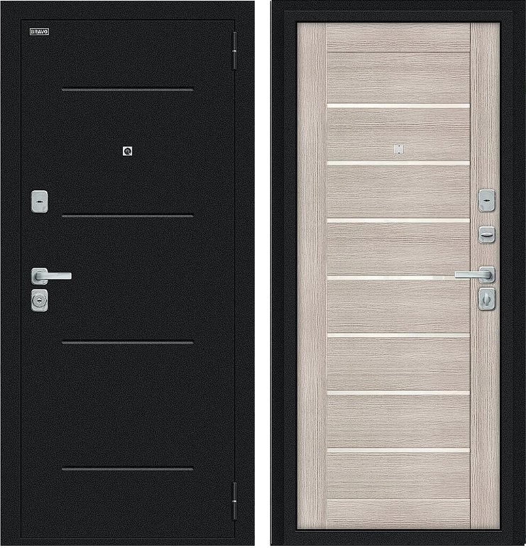 Надежная входная Дверь Браво Техно/BChrome Букле черное/Cappuccino Melinga премиум класса по цене 32 607 руб. Большая толщина стали защитит от проникновения в ваш дом, квартиру или коттедж. Используется очень качественная фурнитура: замки, цилиндры, ручки, защелки. Покрытие и отделка двери изготовлено под внимательным контролем производителя. Дверь имеет долгий срок службы и гарантию.