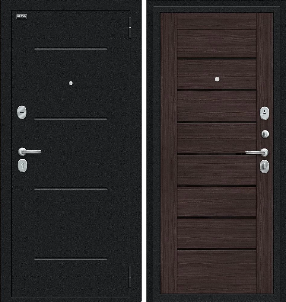 Надежная входная Дверь Браво Техно Букле черное/Wenge Veralinga премиум класса по цене 30 857 руб. Большая толщина стали защитит от проникновения в ваш дом, квартиру или коттедж. Используется очень качественная фурнитура: замки, цилиндры, ручки, защелки. Покрытие и отделка двери изготовлено под внимательным контролем производителя. Дверь имеет долгий срок службы и гарантию.